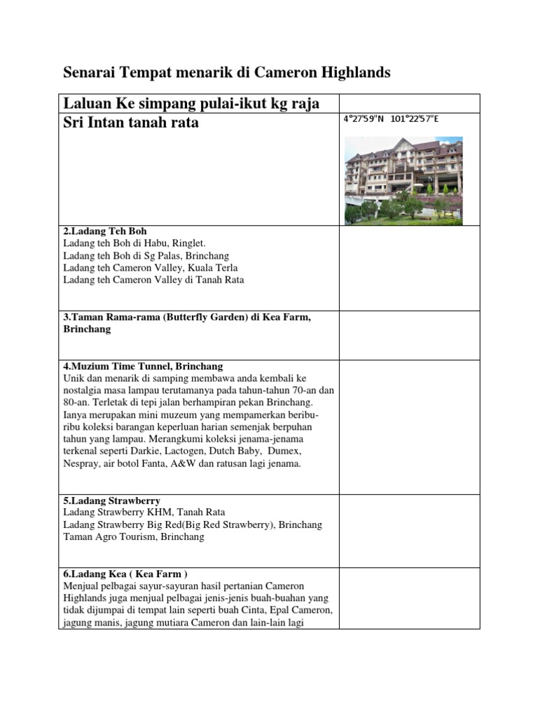 Rencana perjalanan tertutup untuk semua tempat penting untuk dikunjungi di cameron highlands! Anda juga boleh memetik buah strawberi segar di genting. Seperti kawasannya, dimana cameron highland adalah pusat peristirahatan di dataran tinggi. Siapa nak bercuti di cameron highlands wajib tahu info ini kerana inilah harga dan detail tempat yang menarik di cameron highlands (ch).